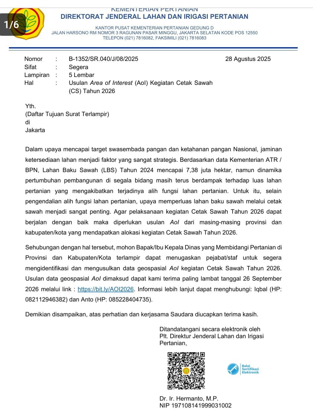 Surat tersebut dengan perihal Usulan Area of Interest (AoI) Kegiatan Cetak Sawah (CS) Tahun 2026.