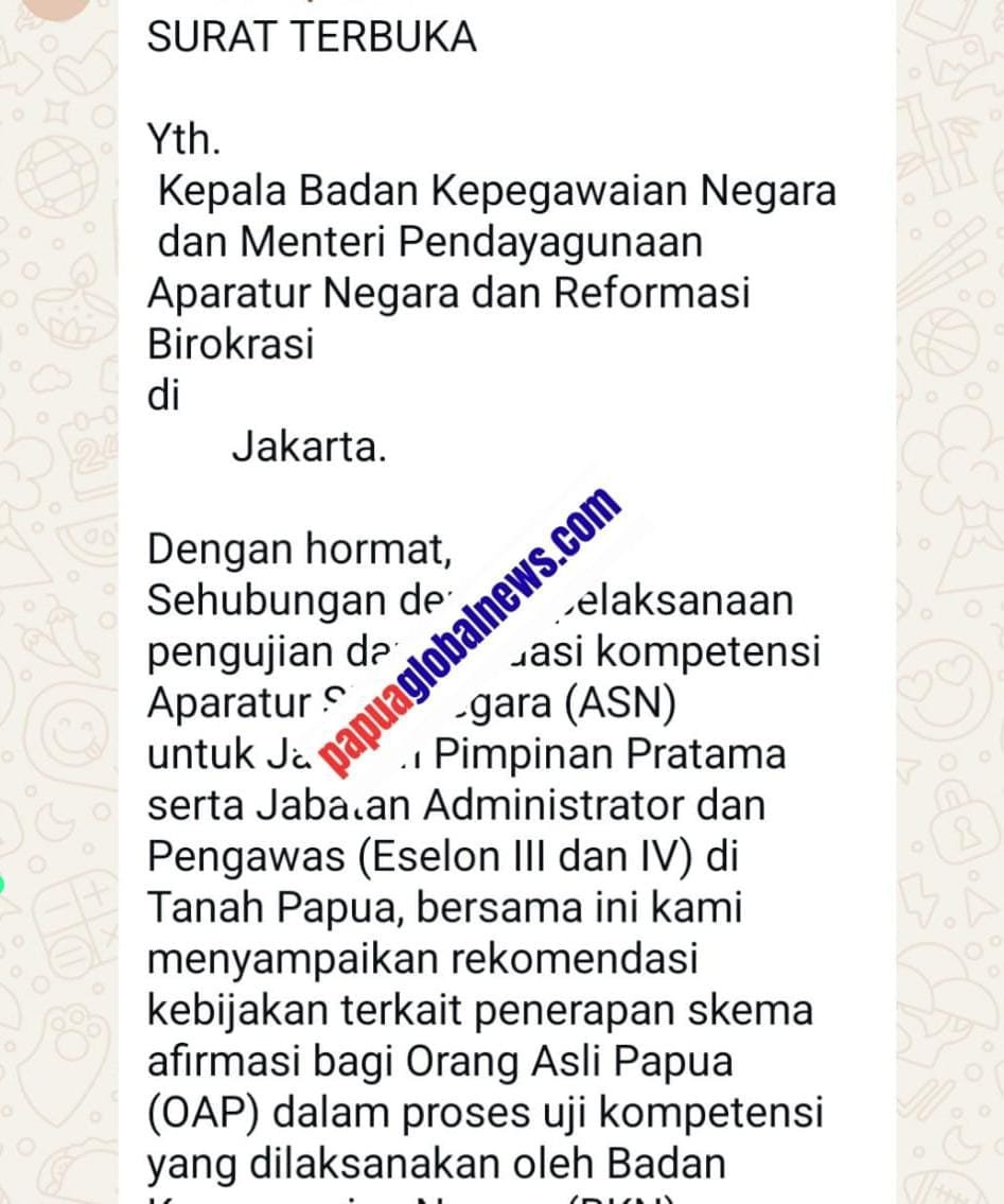 Surat terbuka ini tentang evaluasi kompetensi Aparatur Sipil Negara (ASN) untuk Jabatan Pimpinan Pratama serta Jabatan Administrator dan Pengawas (Eselon III dan IV) di Tanah Papua dan menyampaikan rekomendasi kebijakan terkait penerapan skema afirmasi bagi Orang Asli Papua (OAP) dalam proses uji kompetensi yang dilaksanakan oleh Badan Kepegawaian Negara (BKN).