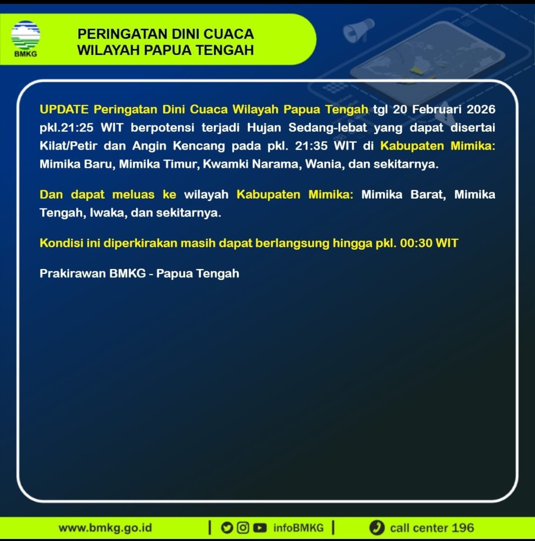 Timika,papuaglobalnews.com – Badan Meteorologi, Klimatologi, dan Geofisika (BMKG) Papua Tengah mengeluarkan peringatan dini cuaca untuk wilayah Kabupaten Mimika, Jumat 20 Februari 2026 pukul 22.50 WIT.