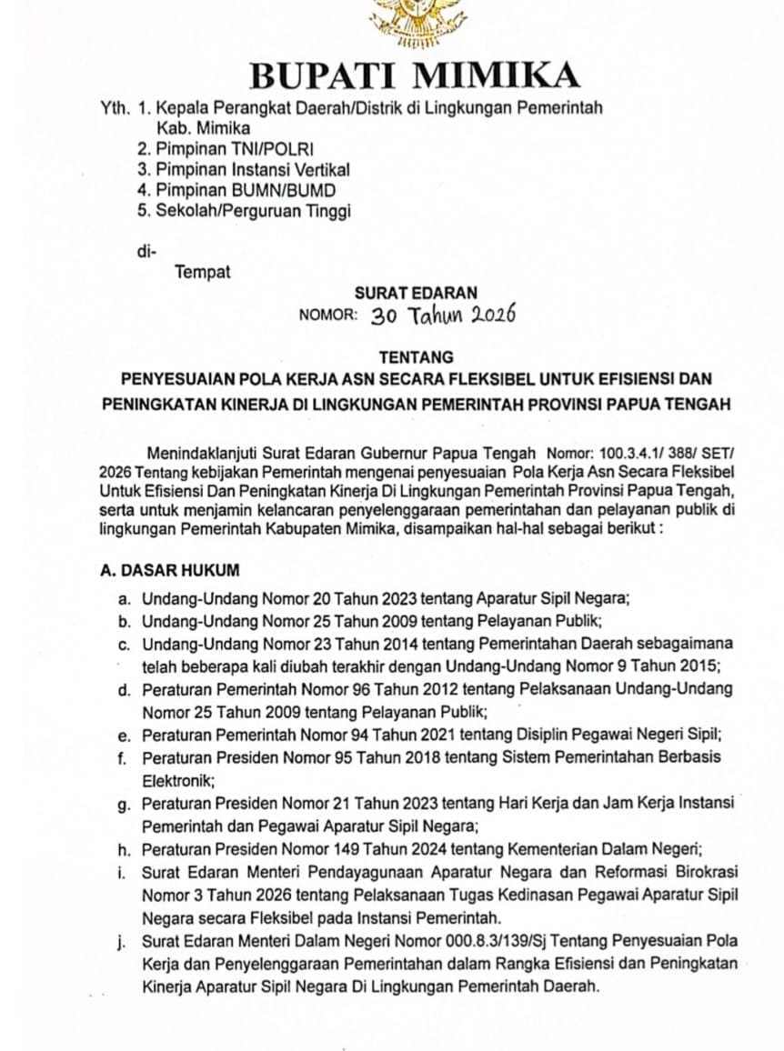 Kebijakan ini merupakan tindak lanjut dari Surat Edaran Gubernur Papua Tengah nomor 100.3.4.1/388/SET/2026 tentang kebijakan pemerintah mengenai penyesuaian pola kerja ASN secara fleksibel untuk efisiensi dan peningkatan kinerja di lingkungan Pemerintah Provinsi Papua Tengah, serta untuk menjamin kelancaran penyelenggaraan pemerintahan dan pelayanan publik di lingkungan Pemerintah Kabupaten Mimika, disampaikan hal-hal sebagai berikut: dengan dasar hukum: