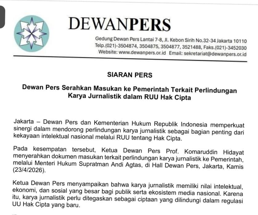 “Dewan Pers memandang karya jurnalistik harus ditegaskan sebagai ciptaan yang dilindungi karena memiliki nilai intelektual, ekonomi, dan sosial bagi publik,” tegas Ketua Dewan Pers dalam siaran persnya.