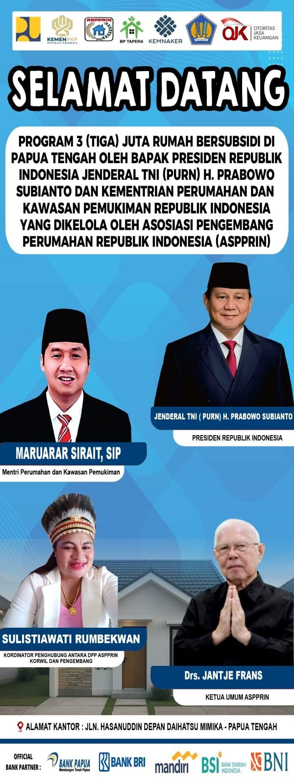 Timika,papuaglobalnews.com – Dalam rangka mendukung program nasional pembangunan tiga juta rumah bersubsidi, khususnya bagi masyarakat di lima provinsi di Papua, Pemerintah Pusat melalui Dewan Pimpinan Pusat (DPP) Aspprin resmi membuka Kantor DPP Aspprin Wilayah Papua di Kabupaten Mimika, Provinsi Papua Tengah.