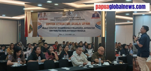 Timika, papuaglobalnews.com — Dinas Tenaga Kerja dan Transmigrasi (Disnakertrans) Kabupaten Mimika bekerja sama dengan BPJS Ketenagakerjaan menggelar Bimbingan Teknis (Bimtek) Struktur Skala Upah melalui kegiatan pengembangan pelaksana Jamsostek dan fasilitas kesejahteraan pekerja selama dua hari, Selasa dan Rabu 18-19 November 2025. Kegiatan ini diikuti para pengusaha dan kontraktor selaku pemberi upah kepada pekerja.
