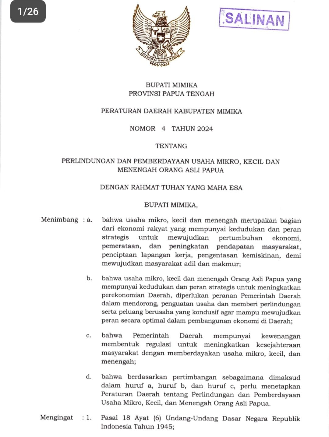 Isi Lengkap Perda Nomor 4 Tahun 2024 Tentang Perlindungan dan Pemberdayaan UMKM OAP