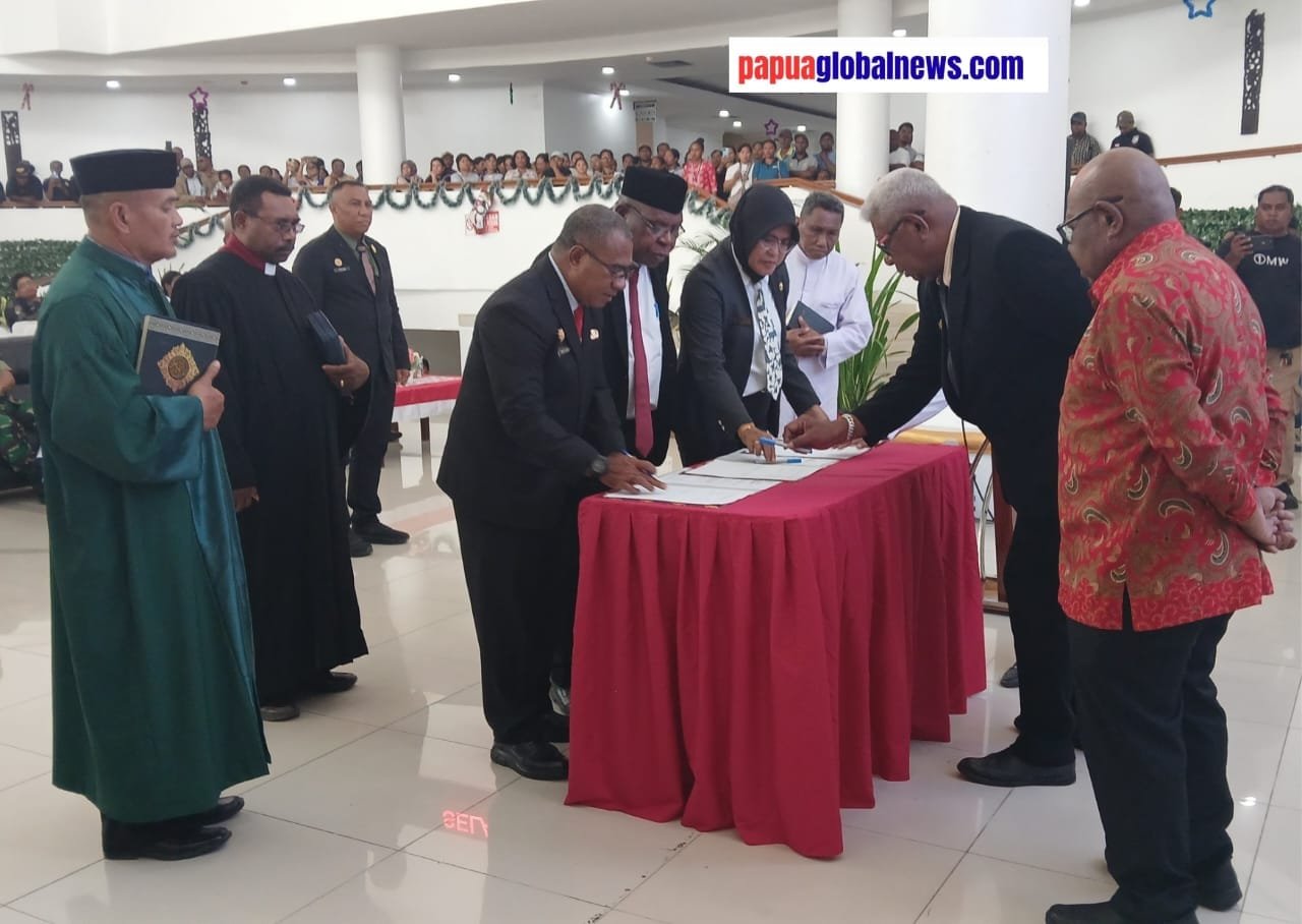 Timika,papuaglobalnews.com – Kado Natal 25 Desember 2025 dan Tahun Baru 2026 (Nataru)! Johannes Rettob Bupati Mimika didampingi Emanuel Kemong, Wakil Bupati Mimika melantik dan pengambilan sumpah janji jabatan terhadap lima Pimpinan Jabatan Tinggi (PJT) Pratama di lingkungan Pemerintah Kabupaten (Pemkab) Mimika diakhir tahun di Kantor Pusat Pemerintahan SP 3, Distrik Kuala Kencana, Jumat 19 Desember 2025.