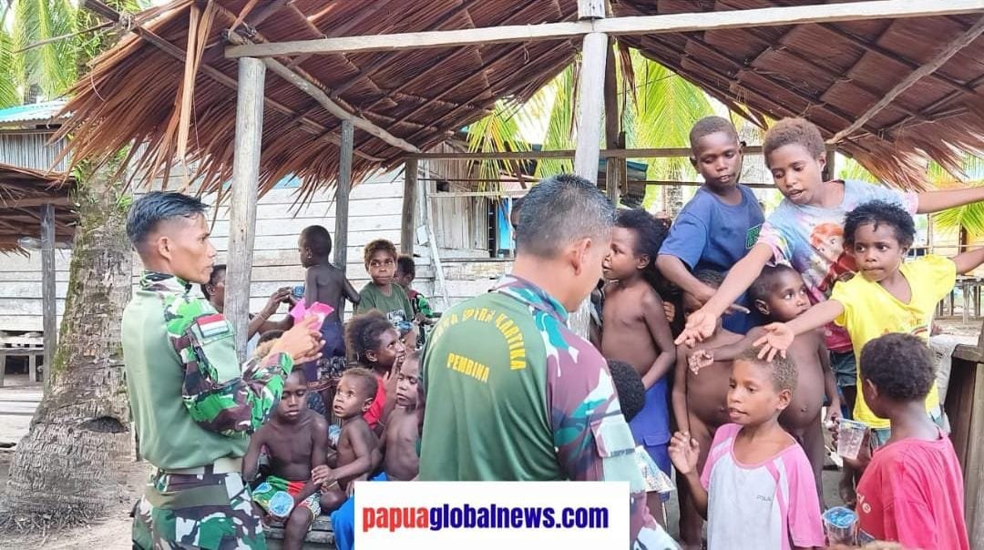 Keakwa,papuaglobalnews.com – Wujud kepedulian dalam membangun kedekatan dengan masyarakat kembali ditunjukkan oleh personel Satgas TMMD Reguler ke-128 Kodim 1710/Mimika, Minggu 26 April 2026. Hal ini terlihat melalui momen berbagi makanan ringan dan permen kepada anak-anak di Kampung Keakwa.