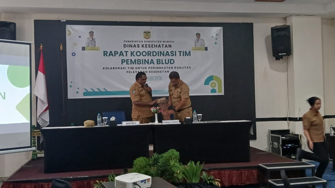 DALAM upaya meningkatkan kualitas pelayanan kesehatan kepada masyarakat, Dinas Kesehatan (Dinkes) Kabupaten Mimika menggelar rapat koordinasi (Rakor) Tim Pembina PPK Badan Layanan Umum Daerah (BLUD) yang melibatkan Puskesmas BLUD, PSC 119, PPK Laboratorium Kesehatan, Badan Pendapatan Daerah (Bapenda), serta Badan Pengelola Keuangan dan Aset Daerah (BPKAD). Kegiatan berlangsung di salah satu hotel di Timika, Selasa 9 Desember 2025.