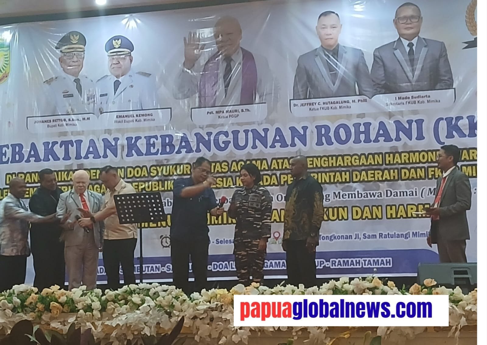 Forum Kerukunan Umat Beragama (FKUB) Kabupaten Mimika sukses melaksanakan Kebaktian Kebangunan Rohani (KKR) berlangsung di Tongkonan, Senin malam 1 Desembere 2025. KKR dirangkai doa bersama lintas agama atas penghargaan Harmoni Award oleh Kementerian Agama RI kepada Pemerintah Daerah dan FKUB Mimika dengan tema besar “Beati pacifici: quoniam filii Dei vocabuntur – Berbahagialah orang yang membawa damai” (Matius 5:9) serta mengusung misi ‘Gerbang Natal menuju Mimika Aman, Rukun, Damai dan Harmoni’ dipimpin Pdt. MPA Mauri, ST.h, Ketua PGGP. Sebelum melaksanakan KKR dan Doa Lintas Agama pada pagi harinya FKUB melaksanakan penjemputan Bupati Mimika Johannes Rettob di Bandara Mozes Kilangin sekaligus pawai penghargaan harmoni award 2025. Rute yang dilalui Jalan Barau C. Heatubun, Jalan Cenderawasih, Jalan Budi Utomo, Jalan Hasanuddin dan berakhir di Vihara Bodhi Mandala.