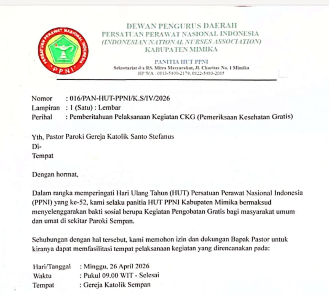 Ketua Panitia HUT PPNI Mimika, Ns. Marlinlee Giyai, S.Tr.Kep, bersama Sekretaris Ema Sirupa, S.Kep Ners, dalam surat pemberitahuan yang ditujukan kepada Pastor Paroki Gereja Katolik Santo Stefanus menyampaikan bahwa kegiatan ini merupakan bentuk kepedulian tenaga kesehatan terhadap masyarakat.