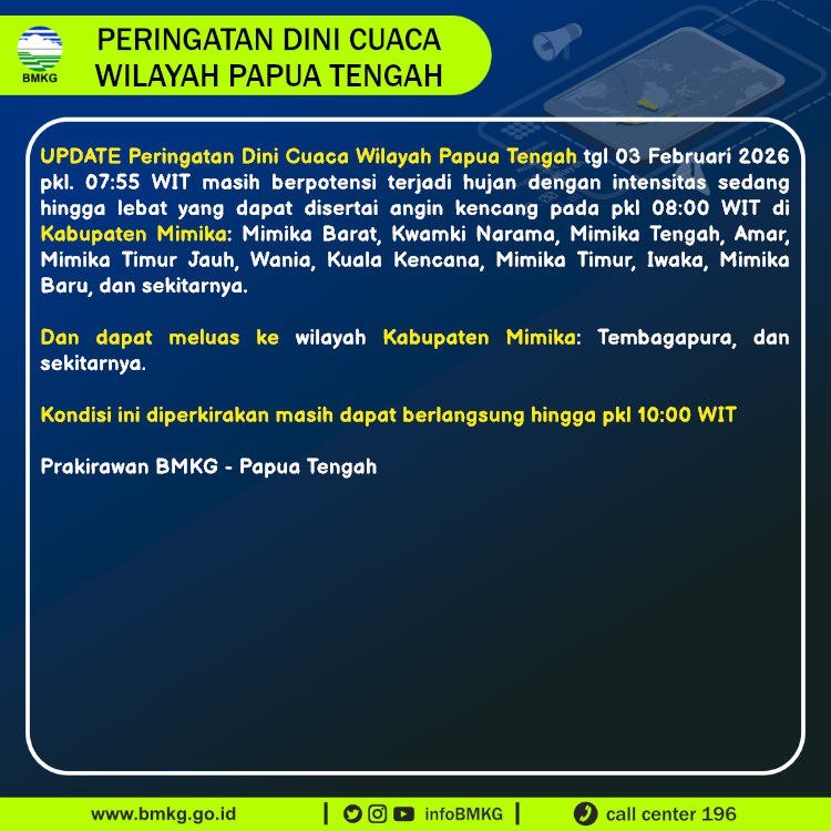 Timika,papuaglobalnews.com – Badan Meteorologi, Klimatologi, dan Geofisika (BMKG) Papua Tengah kembali mengeluarkan update peringatan dini cuaca pada Selasa, 3 Februari 2026 pukul 07.55 WIT.