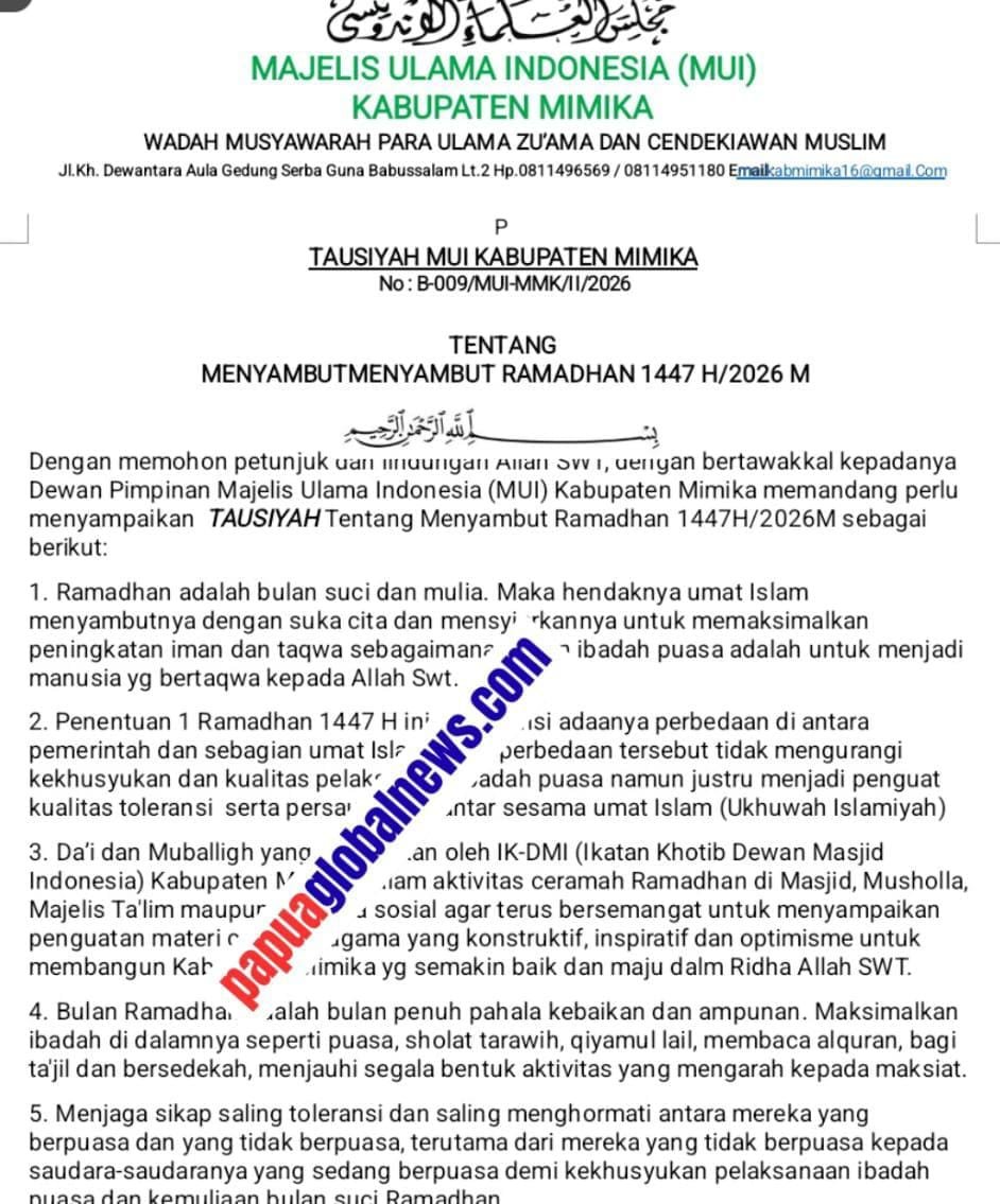 Timika,papuaglobalnews.com – Majelis Ulama Indonesia (MUI) Kabupaten Mimika menerbitkan Tausiyah Nomor: B-009/MUI-MMK/II/2026 tentang menyambut Ramadhan 1447 H/2026 M. Tausiyah tersebut dikeluarkan pada 17 Februari 2026 M bertepatan dengan 29 Sya’ban 1447 H di Timika.