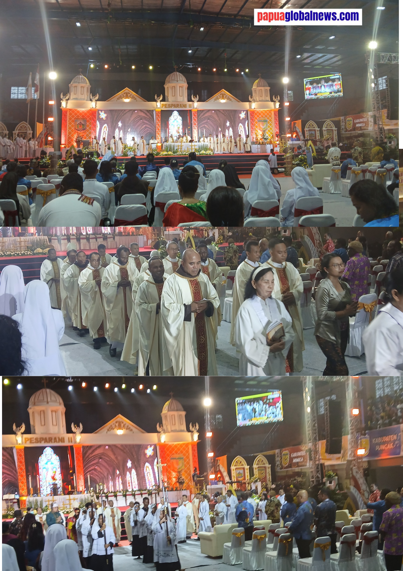 Timika,papuaglobalnews.com – Pelaksanaan Pesta Paduan Suara Gerejani (Pesparani) Katolik II Papua Tengah yang berlangsung di Kabupaten Mimika selama lima hari, mulai Selasa-Sabtu, 2-6 Desember 2025 resmi ditutup. Penutupan ini berlangsung di GOR Futsal SP5 diakhiri dengan erayaan ekaristi kudus dipimpin Uskup Timika Mgr. Bernardus Bofitwos Baru, OSA didampingi 16 imam.