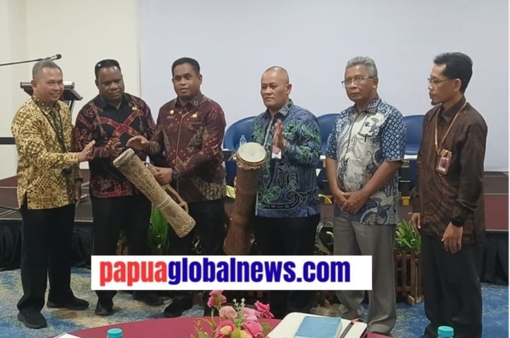 Victor Fun, Asisten III Setda Papua Tengah didampingi para pejabat dan Nasrul, Direktur Fasilitasi Pemberdayaan Transfer dan Pembiayaan Hutang Daerah Direktorat Jenderal Bina Keuangan Daerah Kementerian Dalam Negeri menabuh tifa membuka Rapat Koordinasi Rekonsiliasi SILPA Dana Otsus yang berlangsung di salah satu hotel di Timika, Kamis 12 Marer 2026. (Foto – Anton Juma Songa/papuaglobalnews.com).