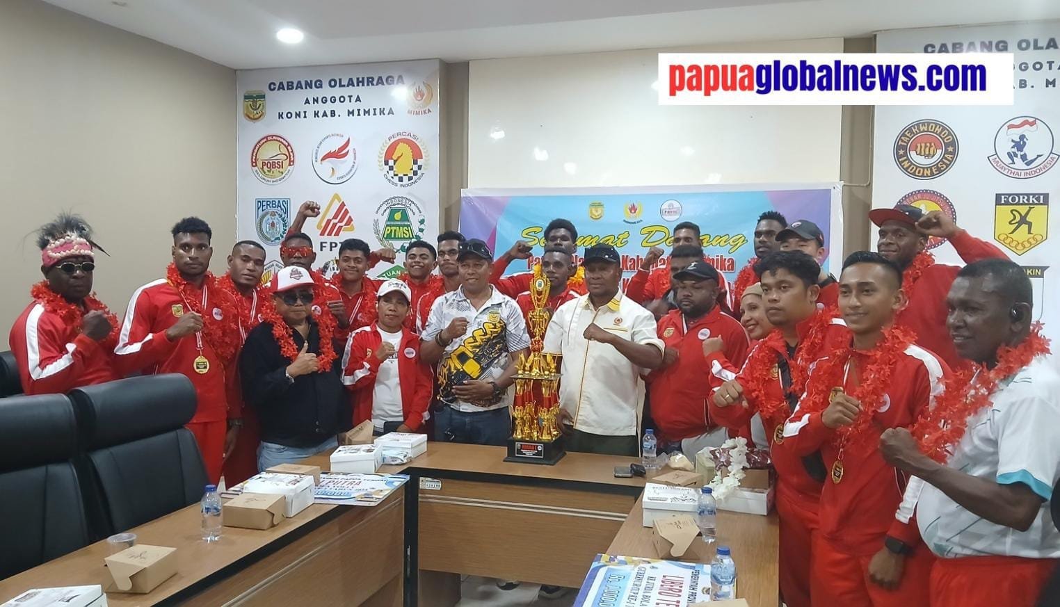 Di Kantor KONI, Sekretaris Pengurus Bola Voli Seluruh Indonesia (PBVSI) Mimika, Daniel Orun menyerahkan piala bergilir dan Maikel Somi, Pelatih Kepala menyerahkan piala tetap kepada Simon Kasamol untuk disimpan.