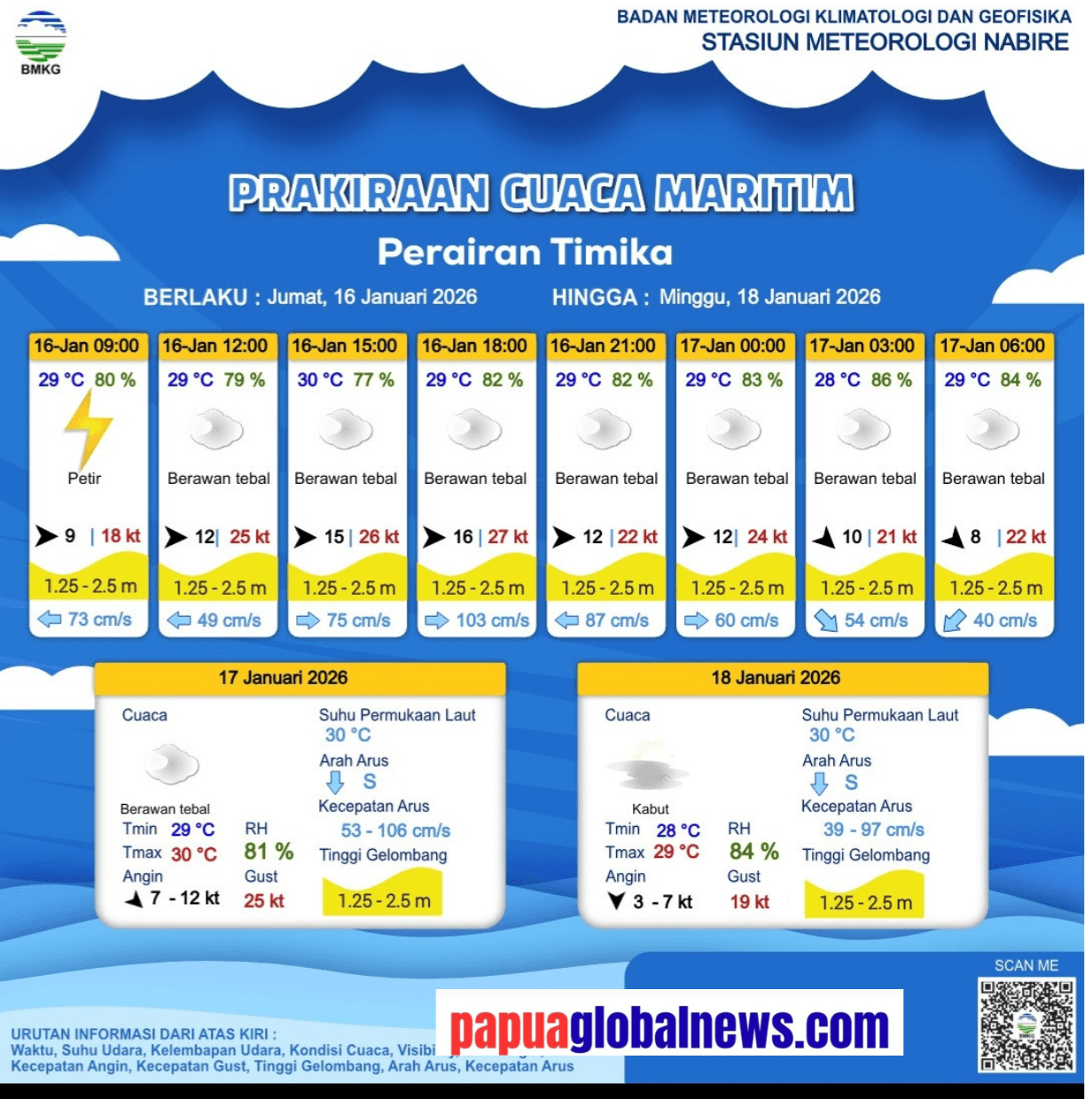 Timika,papuaglobalnews.com – Stasiun Meteorologi Nabire, Badan Meteorologi Klimatologi dan Geofisika (BMKG), merilis prakiraan cuaca maritim untuk wilayah Perairan Timika yang berlaku mulai Jumat 16 Januari 2026 hingga Minggu 18 Januari 2026.